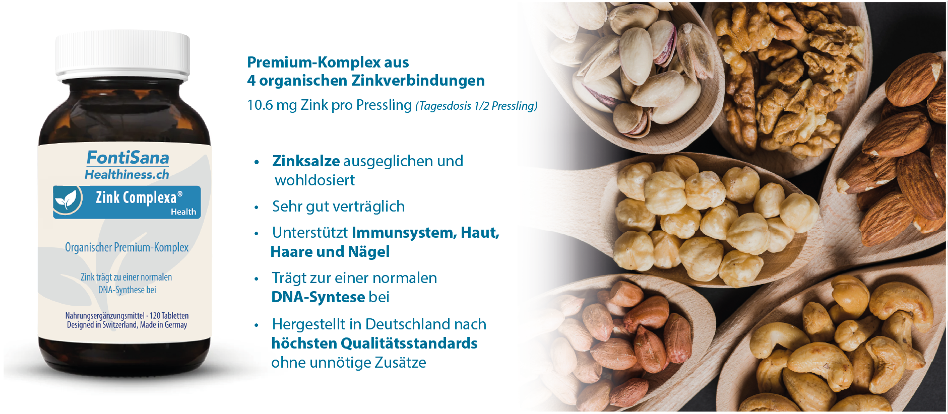 • Täglich 2 Pressinge Zink Complexa®  mindestens 15 Minuten vor oder nach einer Mahlzeit