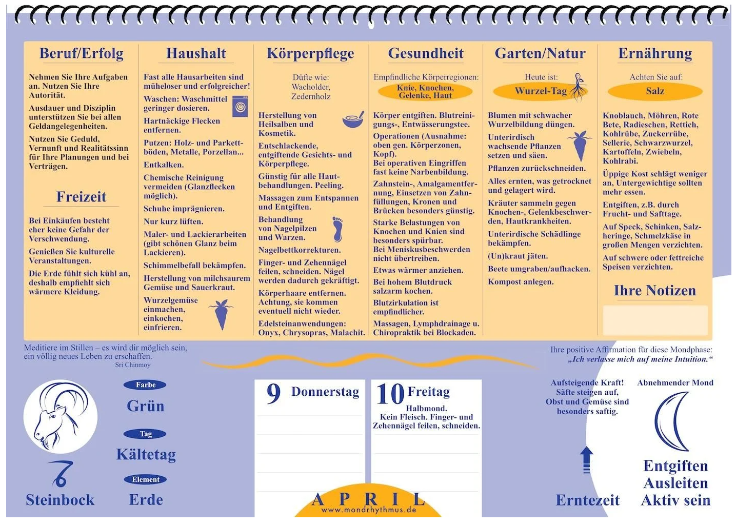 Der Kalender, "Mein Leben mit dem Mondrhytmus-Kalender" gibt Ihnen die Sicherheit, das Richtige zur richtigen Zeit zu tun!